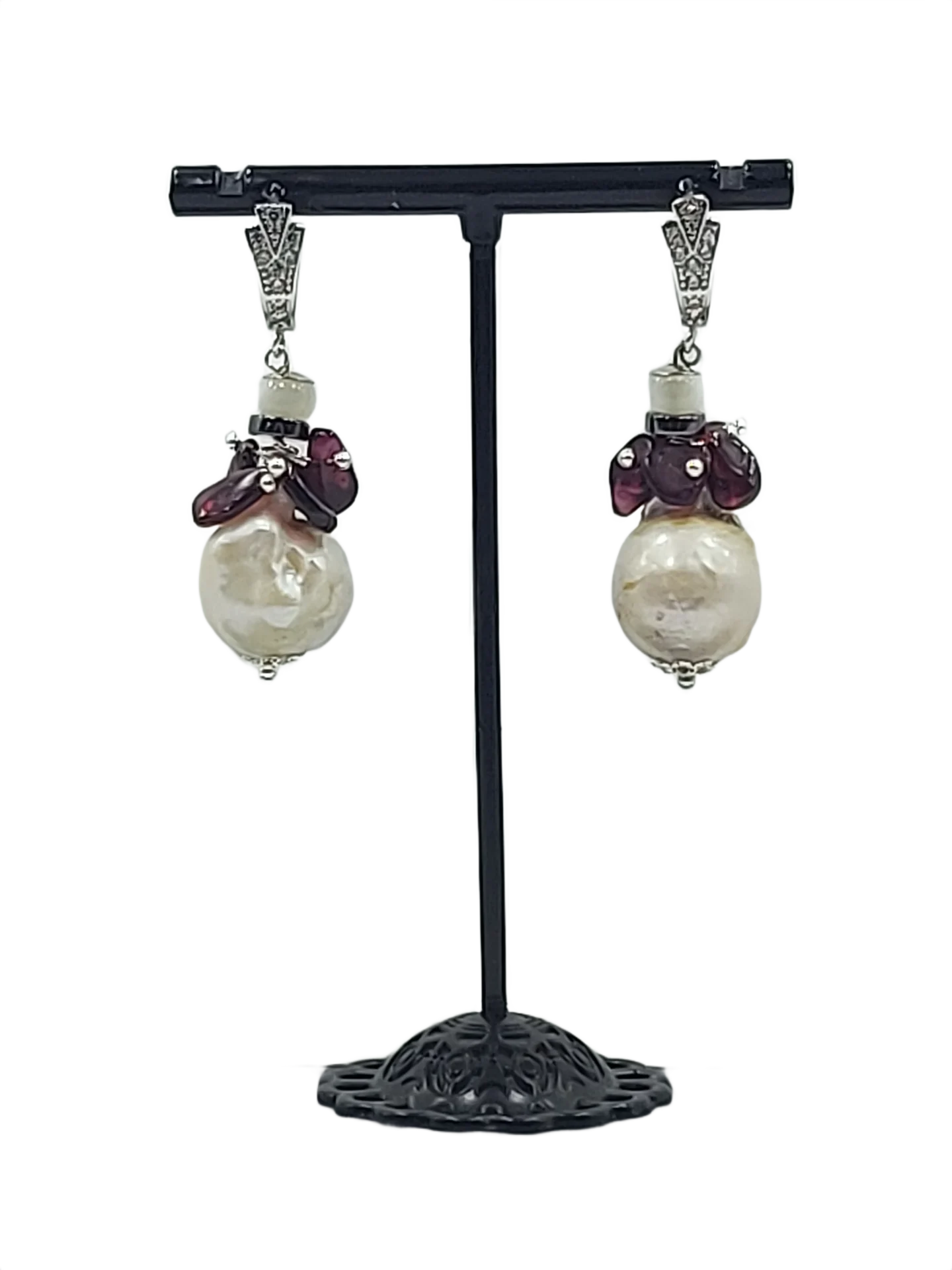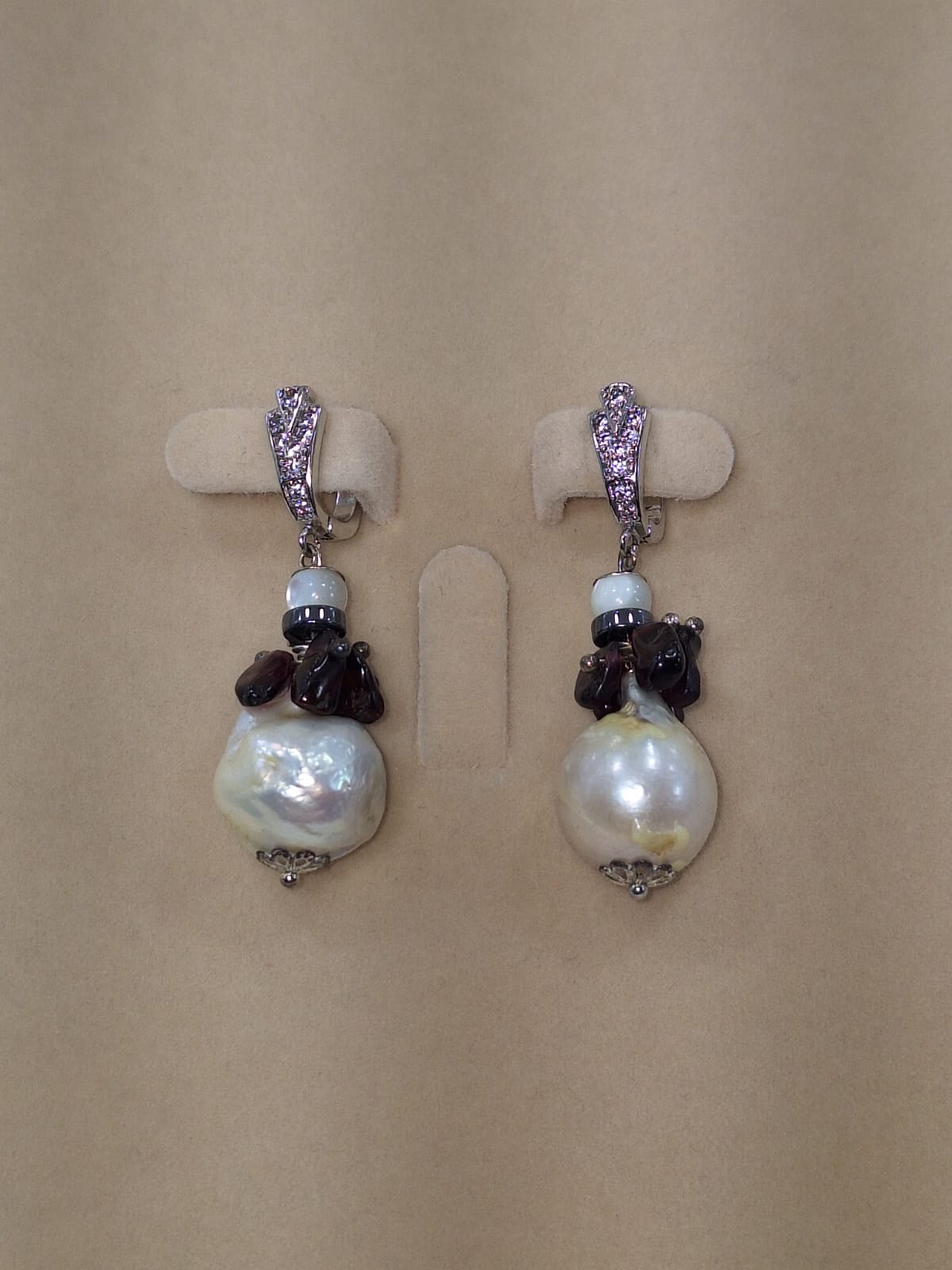 მასალა: თეთრი ბაროკოს მარგალიტი, ძოწი, სადაფის და ჰემატიტის დისკები, ვერცხლისფერი უჟანგავი ფურნიტურა და ანტიალერგიული, ცირკონებით გაწყობილი, ინგლისური სტილის საყურის შესაკრავი.