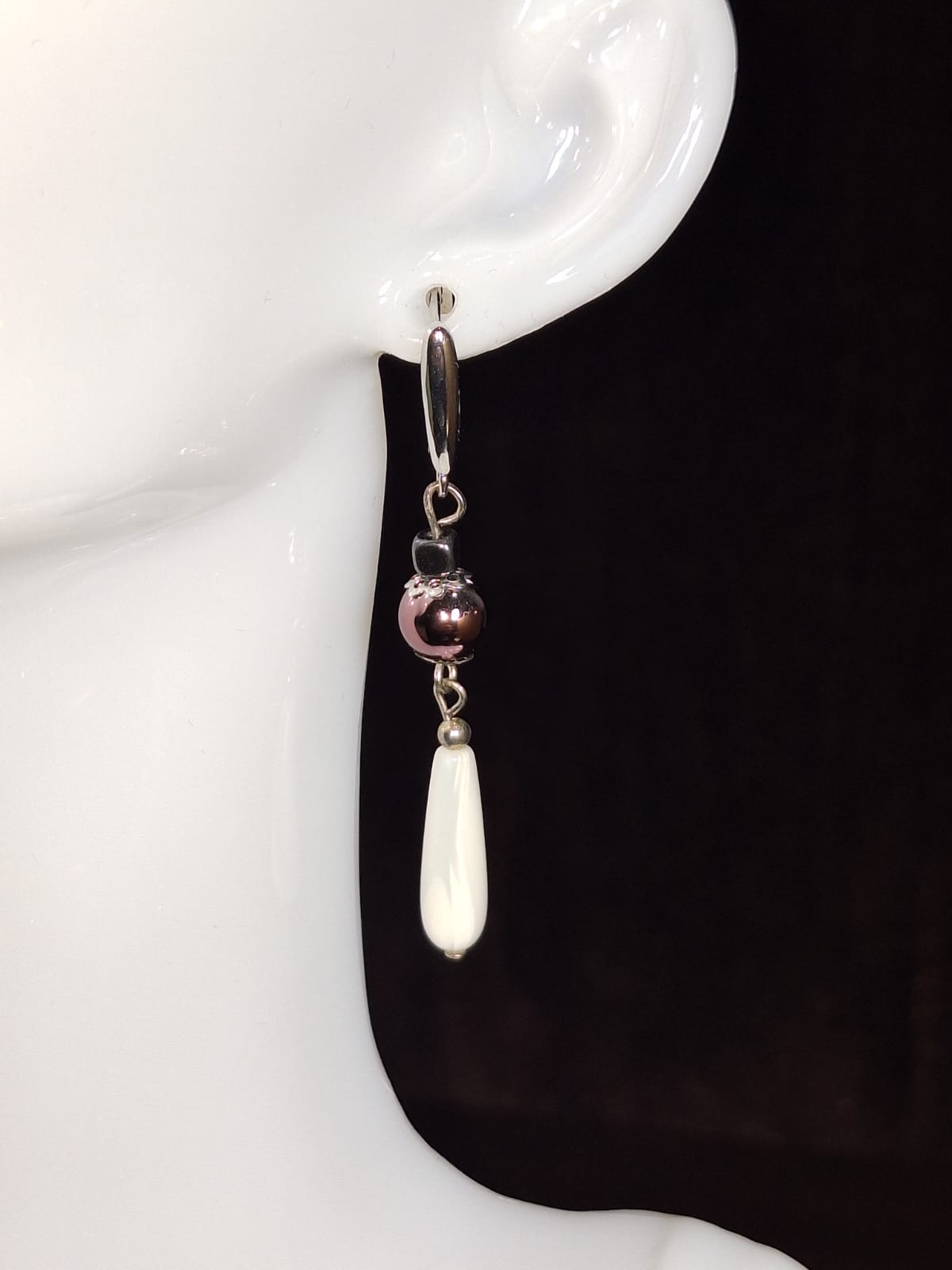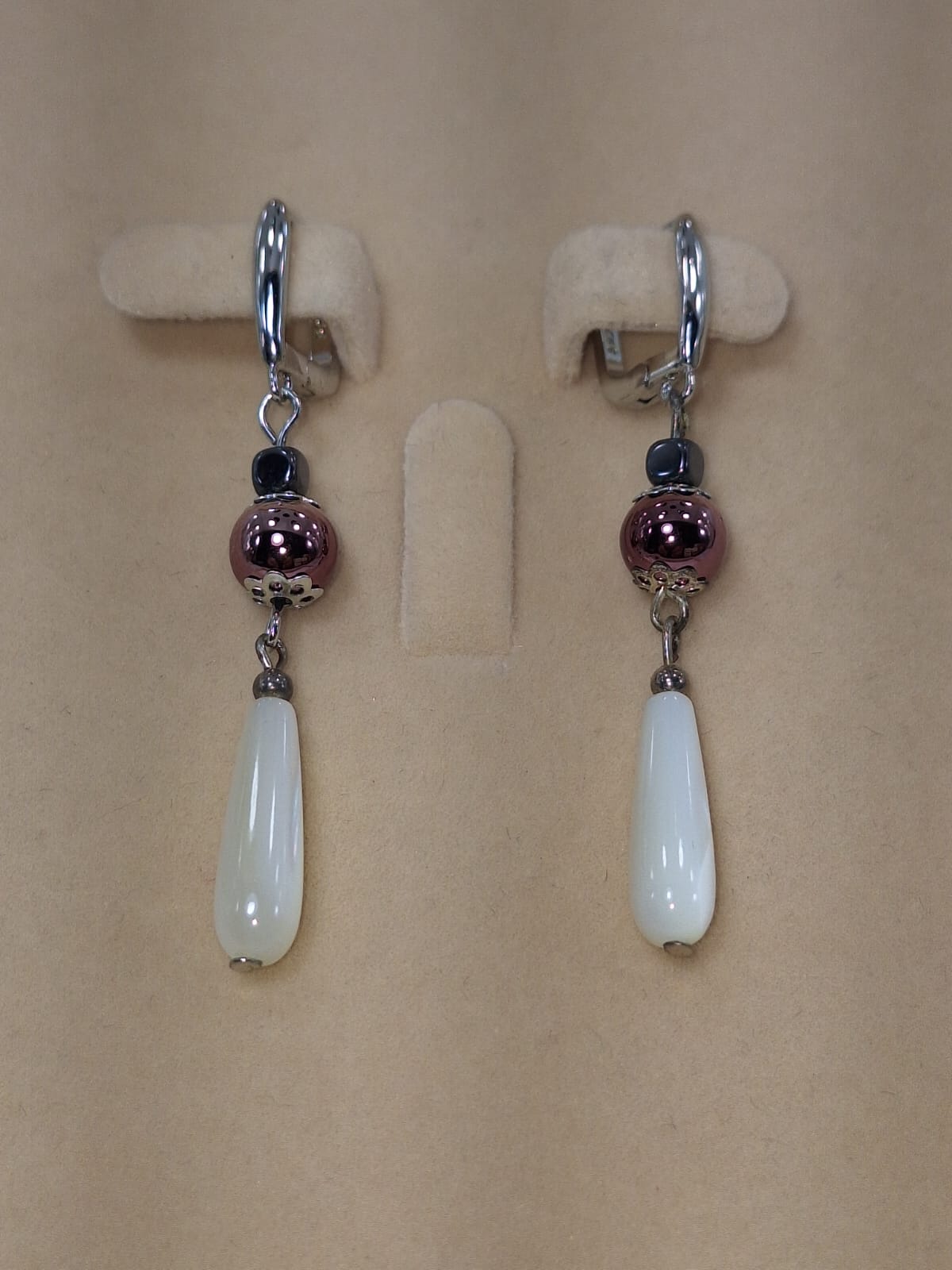 მასალა: ვარდისფერი ჰემატიტი, თეთრი სადაფი, ჰემატიტის კუბიკი, ვერცხლისფერი უჟანგავი ფურნიტურა და ინგლისუტი სტილის შესაკრავი.