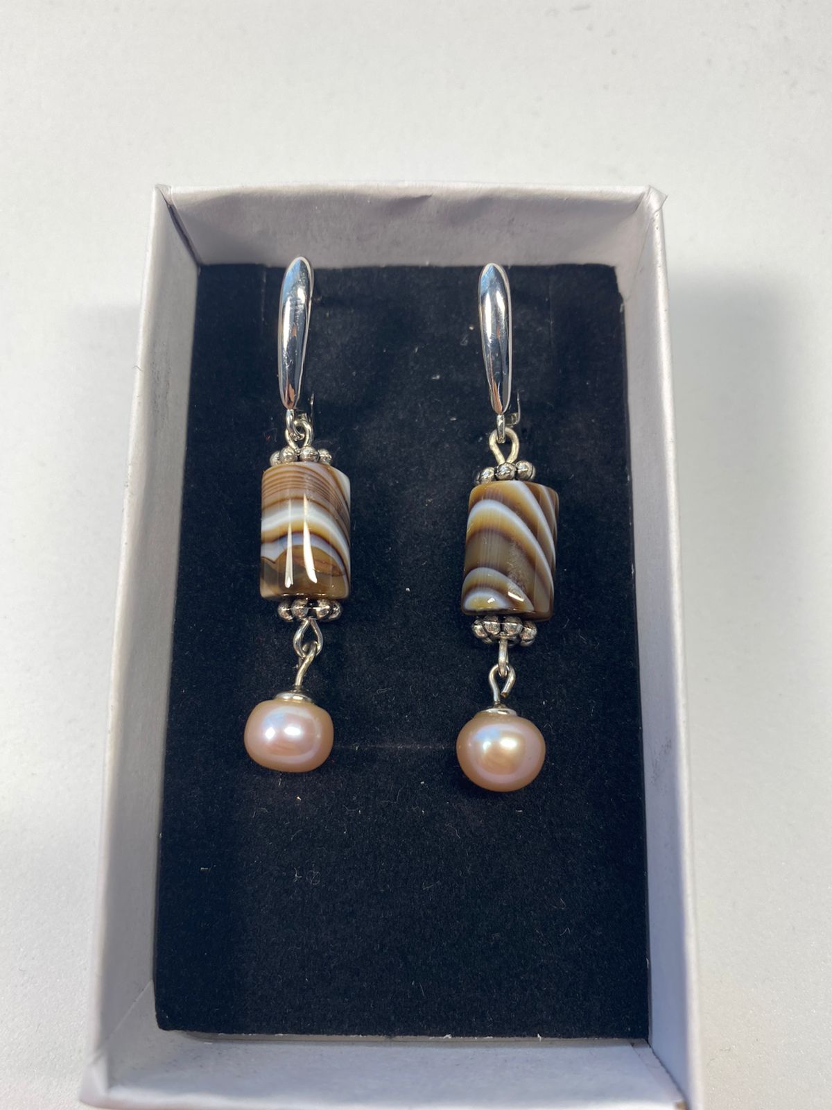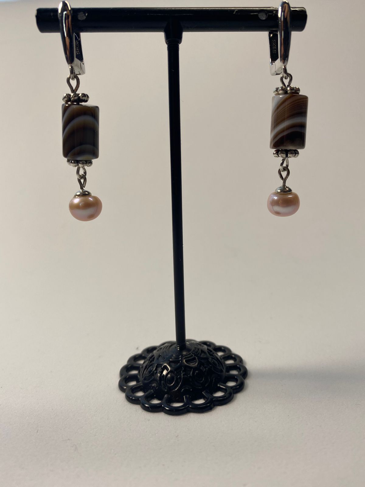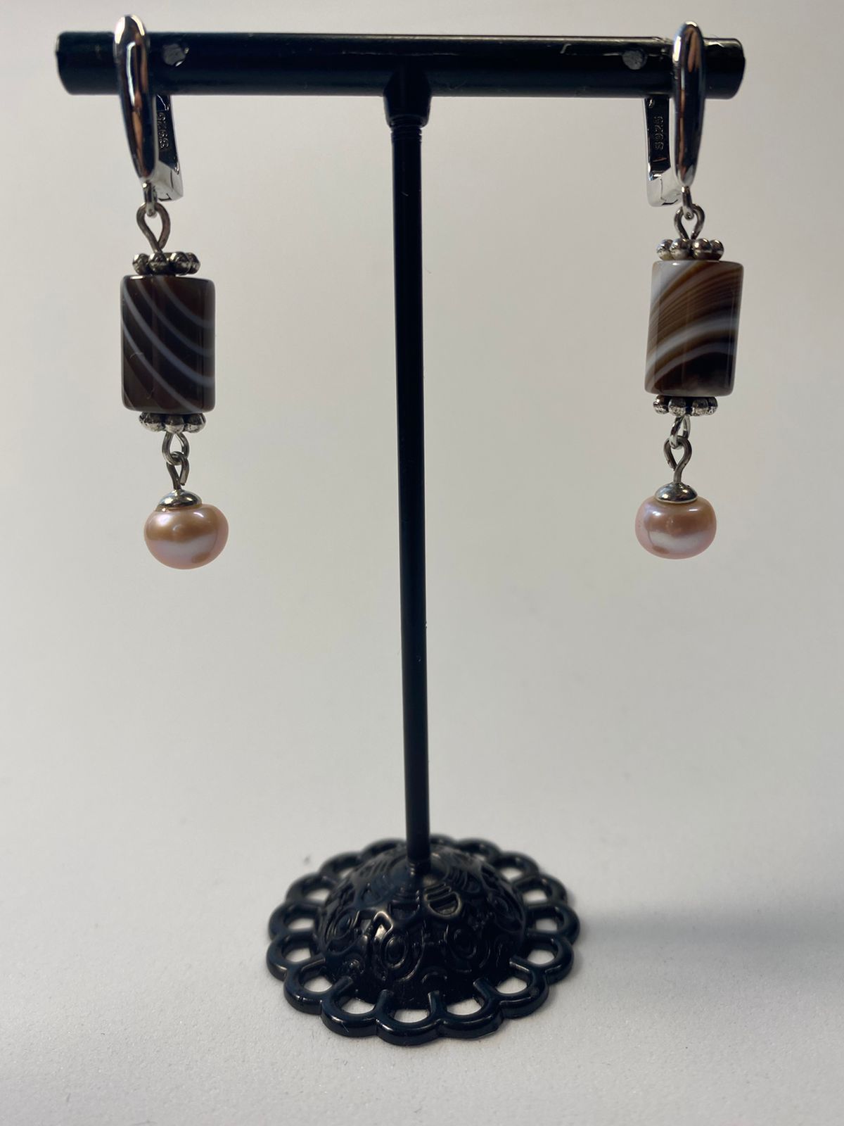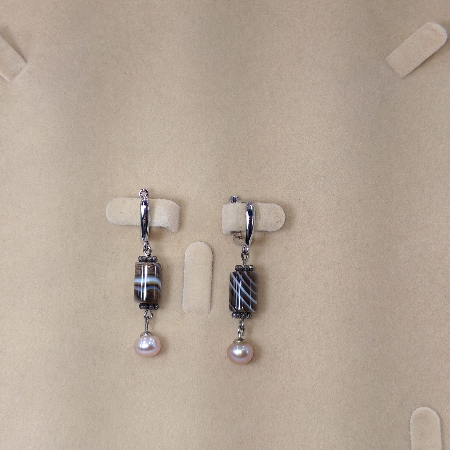 საყურე – ყავისფერი ზოლიანი აგატით და კრემისფერი მარგალიტით