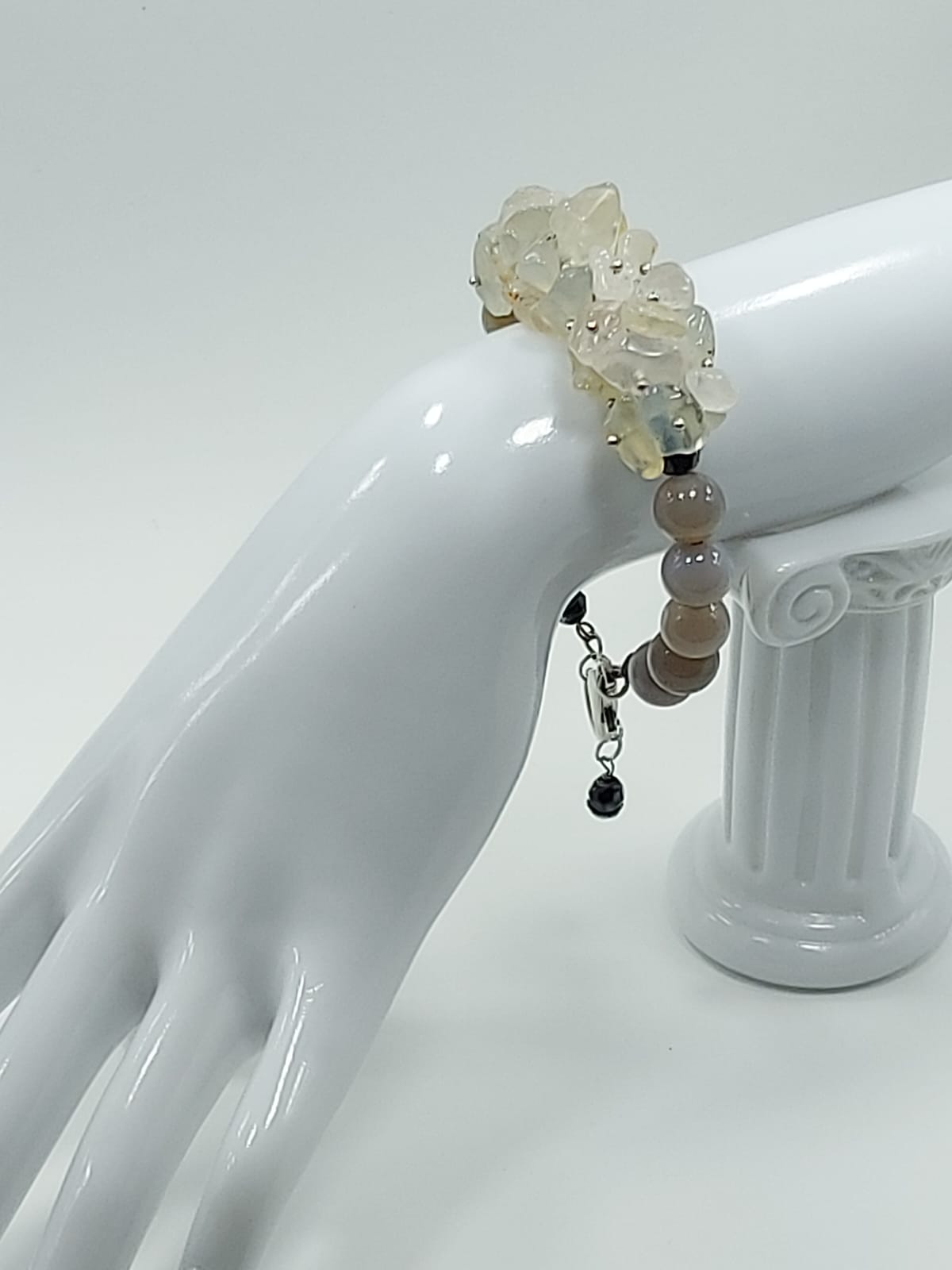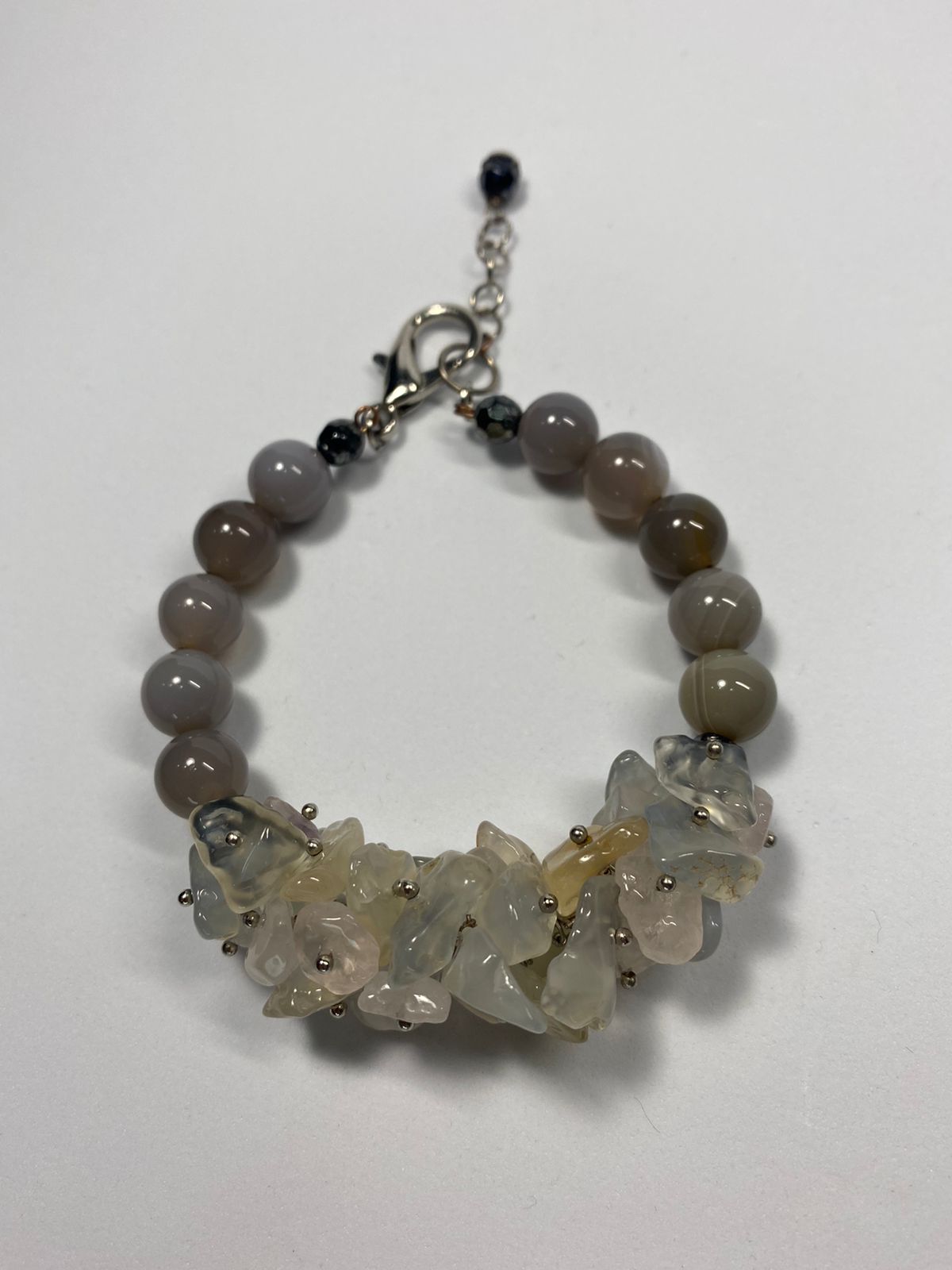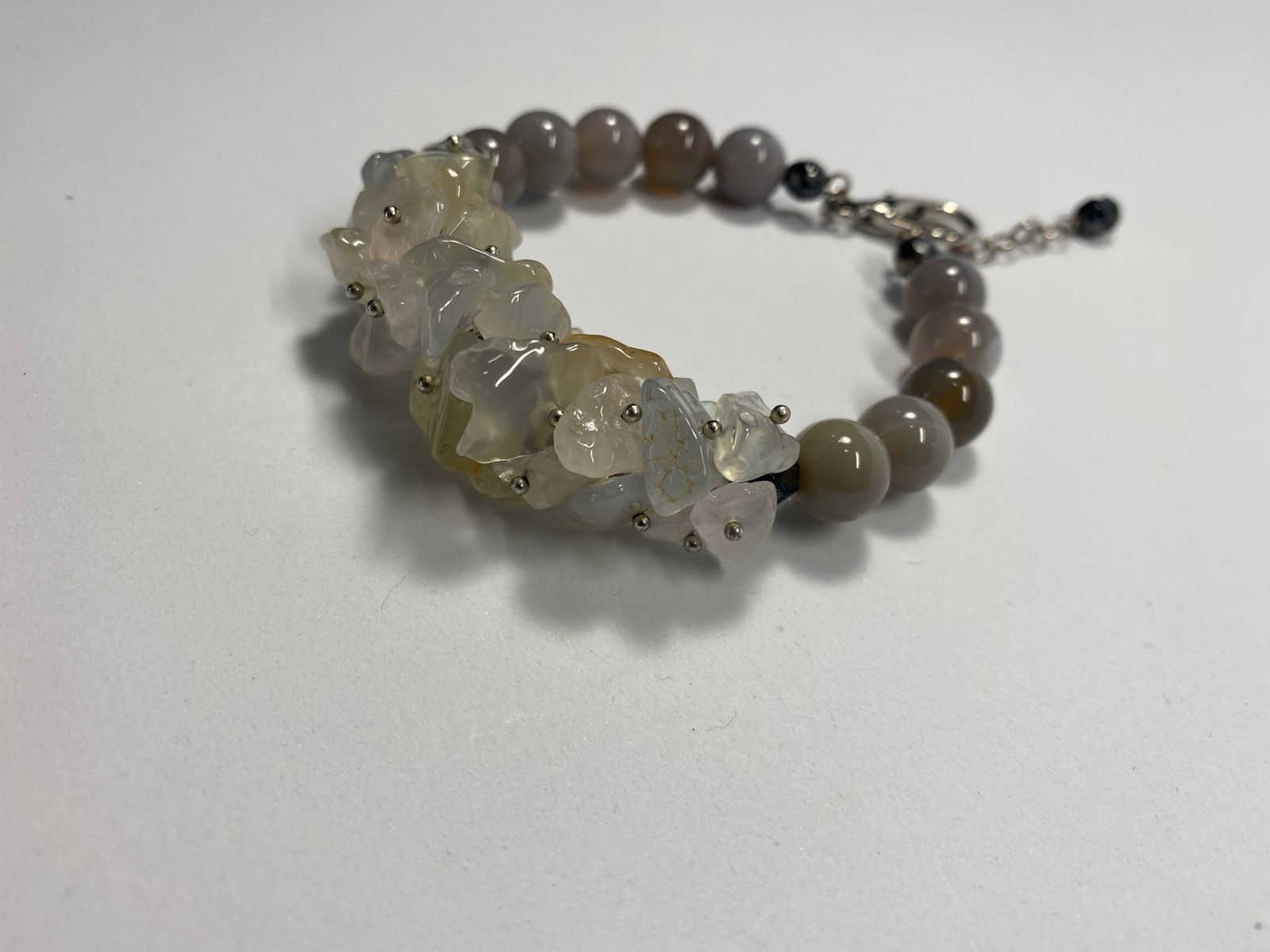 სამაჯურის მასალა: აკვამარინის ნამსხვრევები ვერცხლისფერ პინებზე (დიამეტრი 17მმ), სერი აგატის მძივები (დიამერტი 8მმ), შავი ჩეხური მძივები.