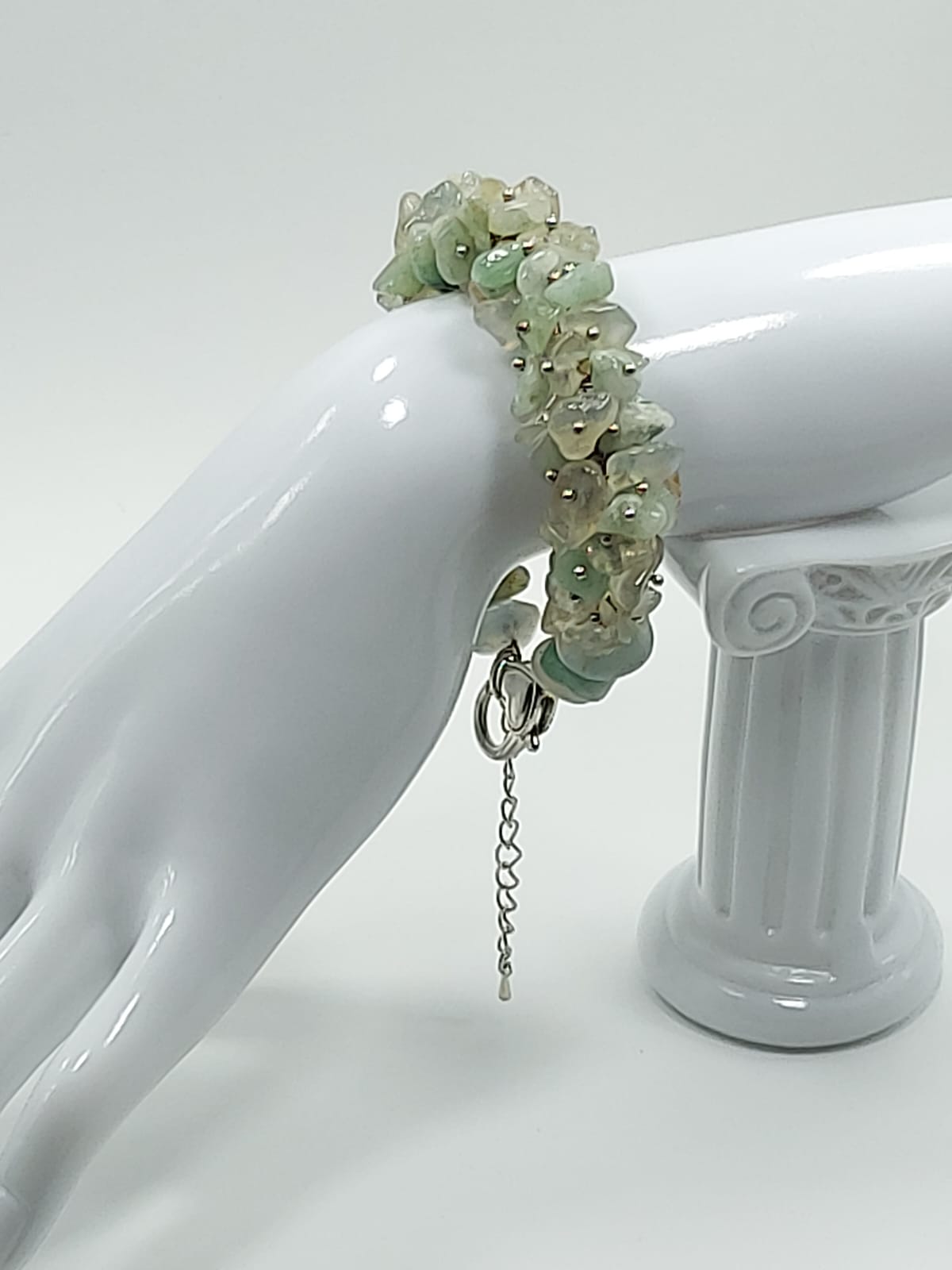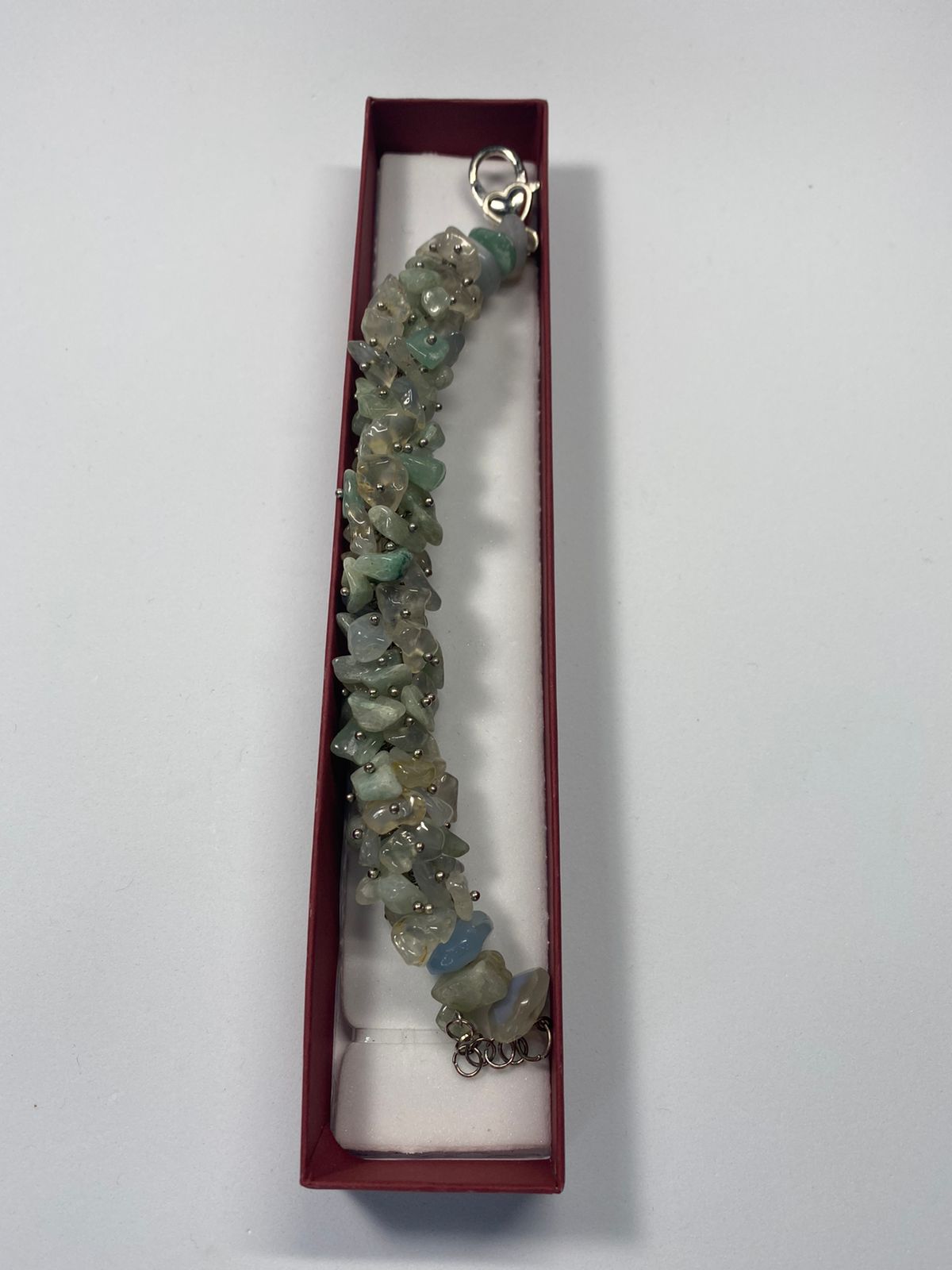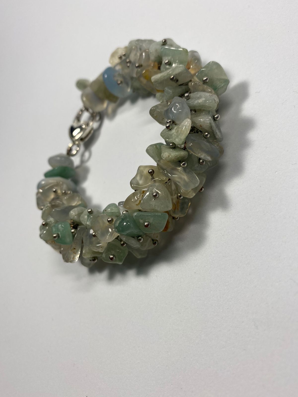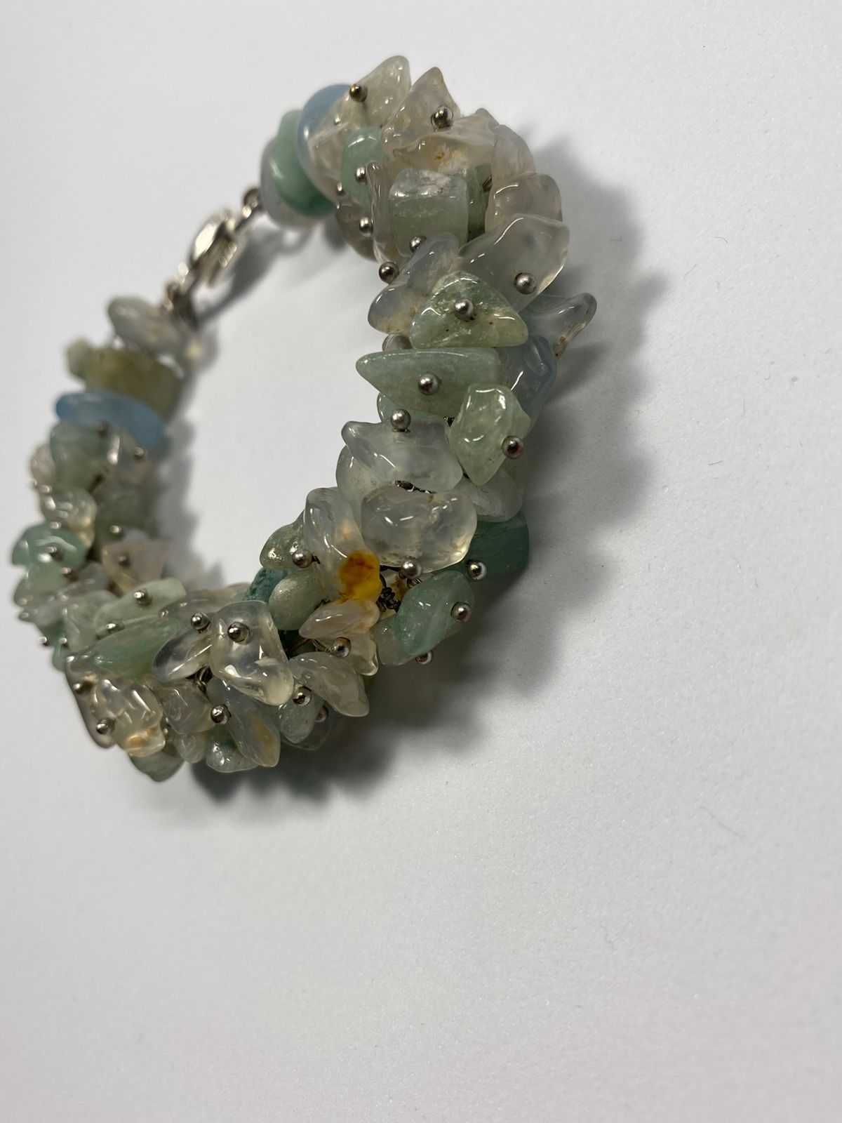 სამაჯურის მასალა: სალათისფერი კვარცის მსხვილი ნამტვრევები ვერცხლისფერ პინებზე (დიამეტრი 19მმ) სალათისფერი კვარცის და აკვამარინის ოვალური ფორმის მძივები (დიამერტი 8მმ).