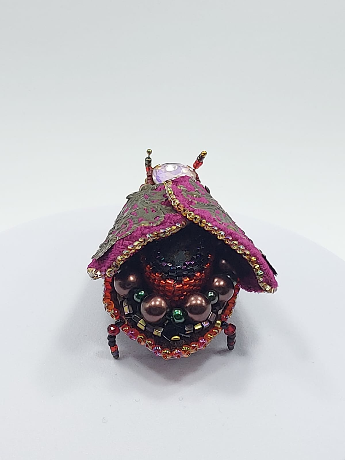 ხოჭო – ბროშის მასალა: ჩეხური ბროლო, ჩეხური მძივი, იაპონირი ბისერი, ხავერდი, ტყავი, ბრინჯაოსფერი ფილიგრანი და ფურნიტურა.