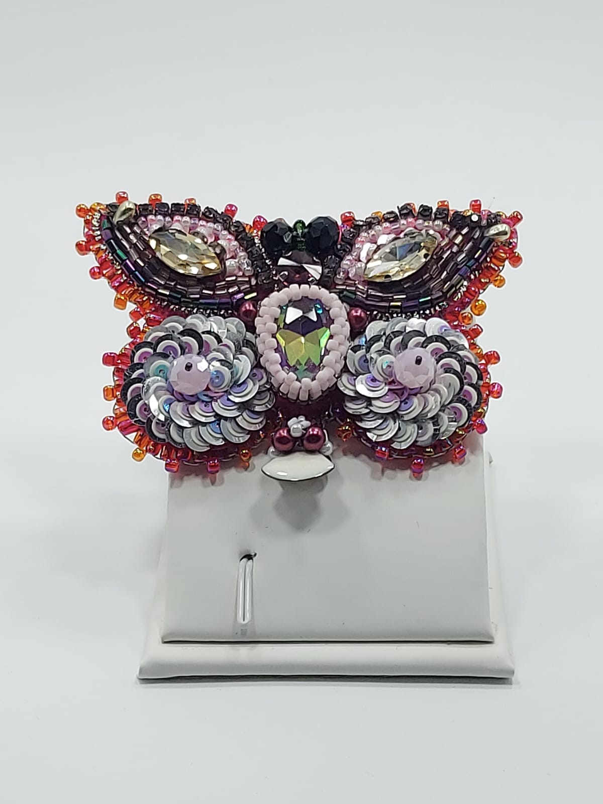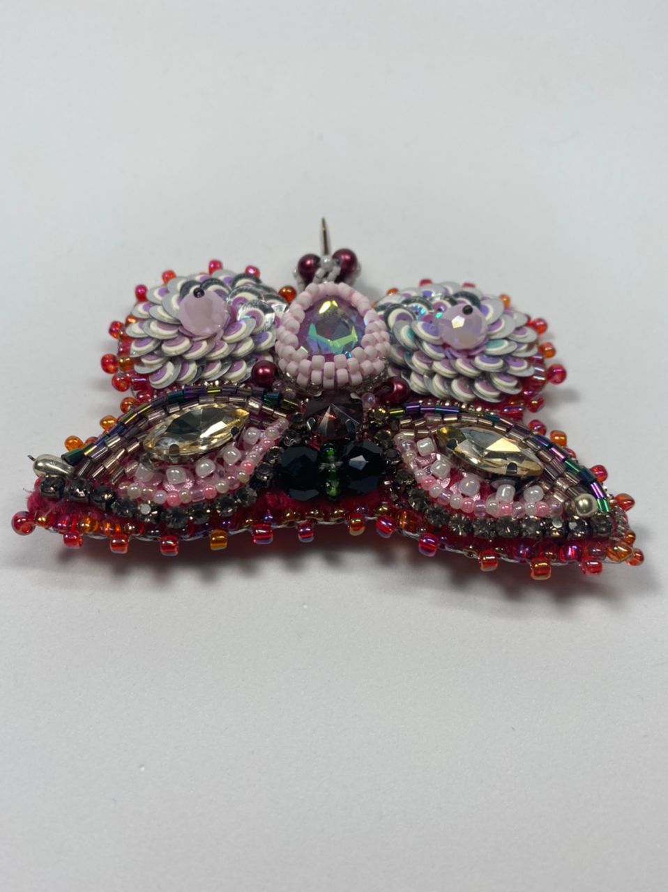 პეპელა – ბროშის მასალა: ჩეხური ბროლო, ჩეხური მძივი, იაპონირი ბისერი, ფრანფული ფარფლები (პაიეტკები), ხავერდი.