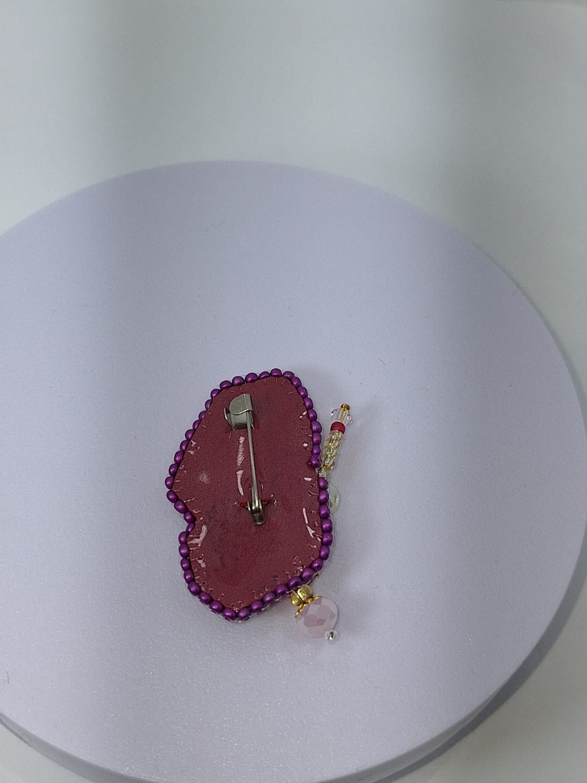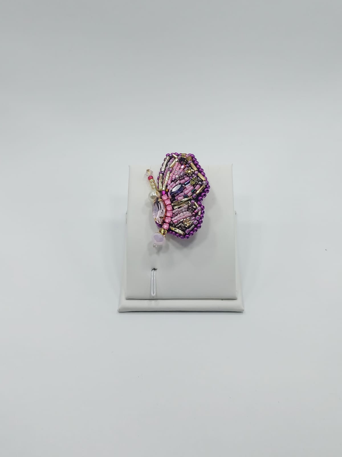 პეპელა – ბროშის მასალა: ჩეხური ბროლო, ჩეხური მძივი, იაპონირი ბისერი, ფრანფული ფარფლები (პაიეტკები), ხავერდი.