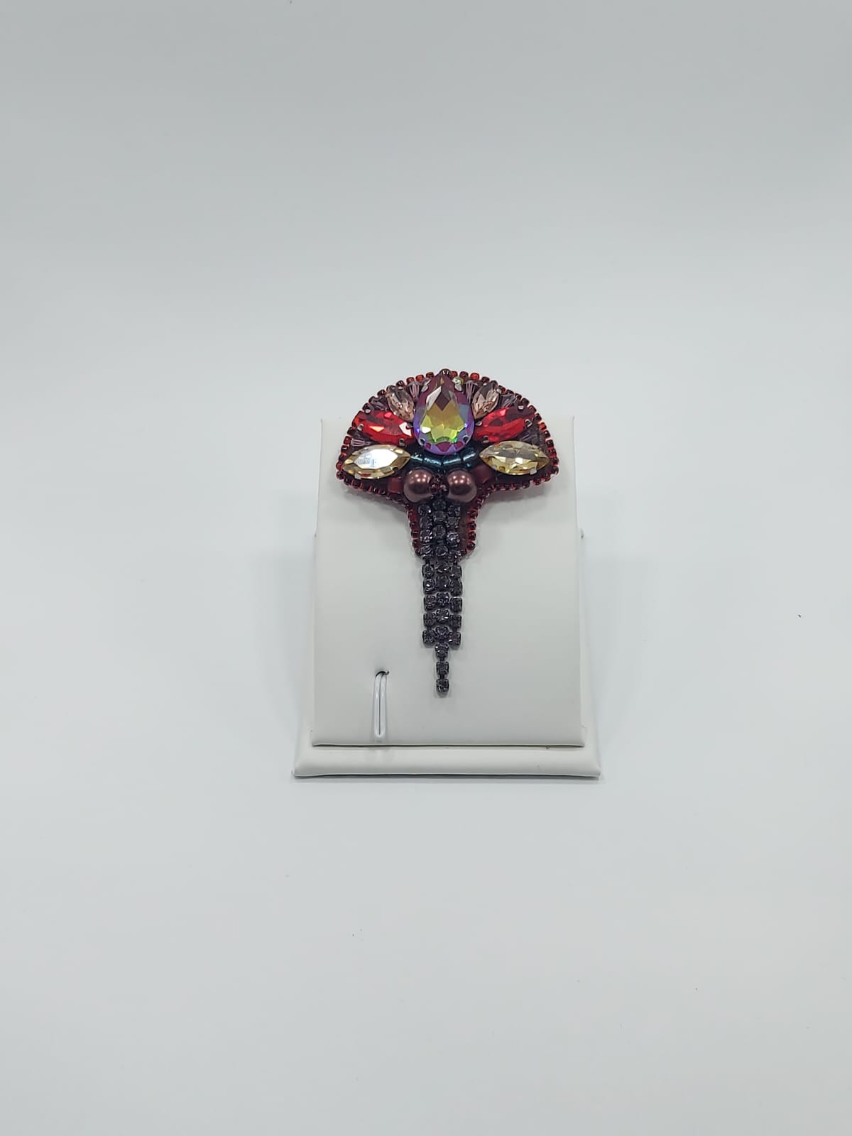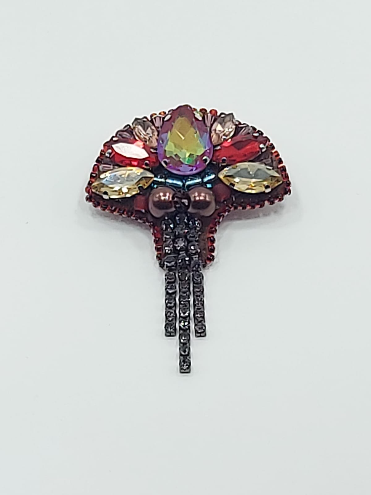 პეპელა – ბროშის მასალა: ჩეხური ბროლო, ჩეხური მძივი, იაპონირი ბისერი, ფრანფული ფარფლები (პაიეტკები), ხავერდი.