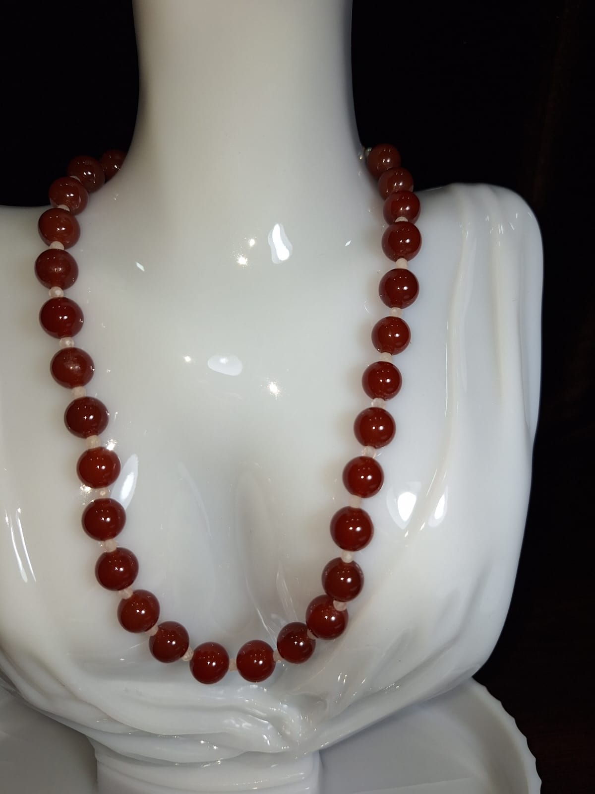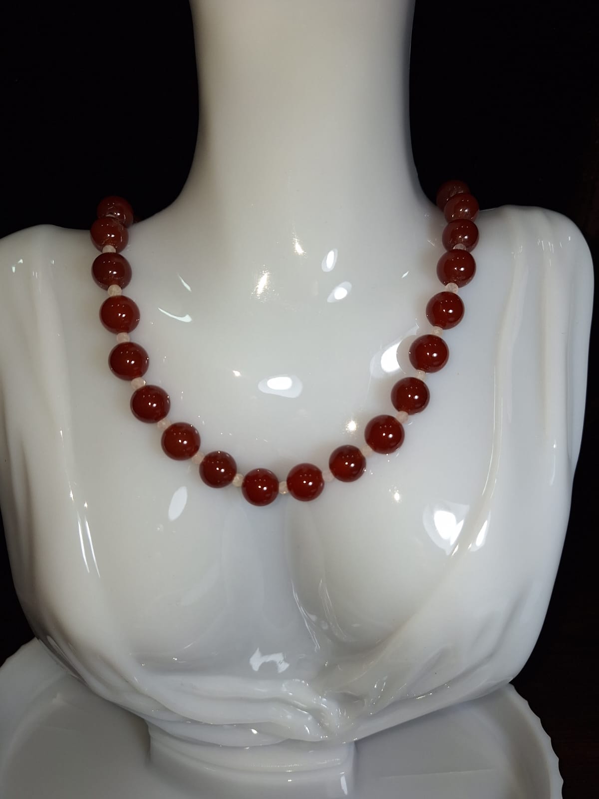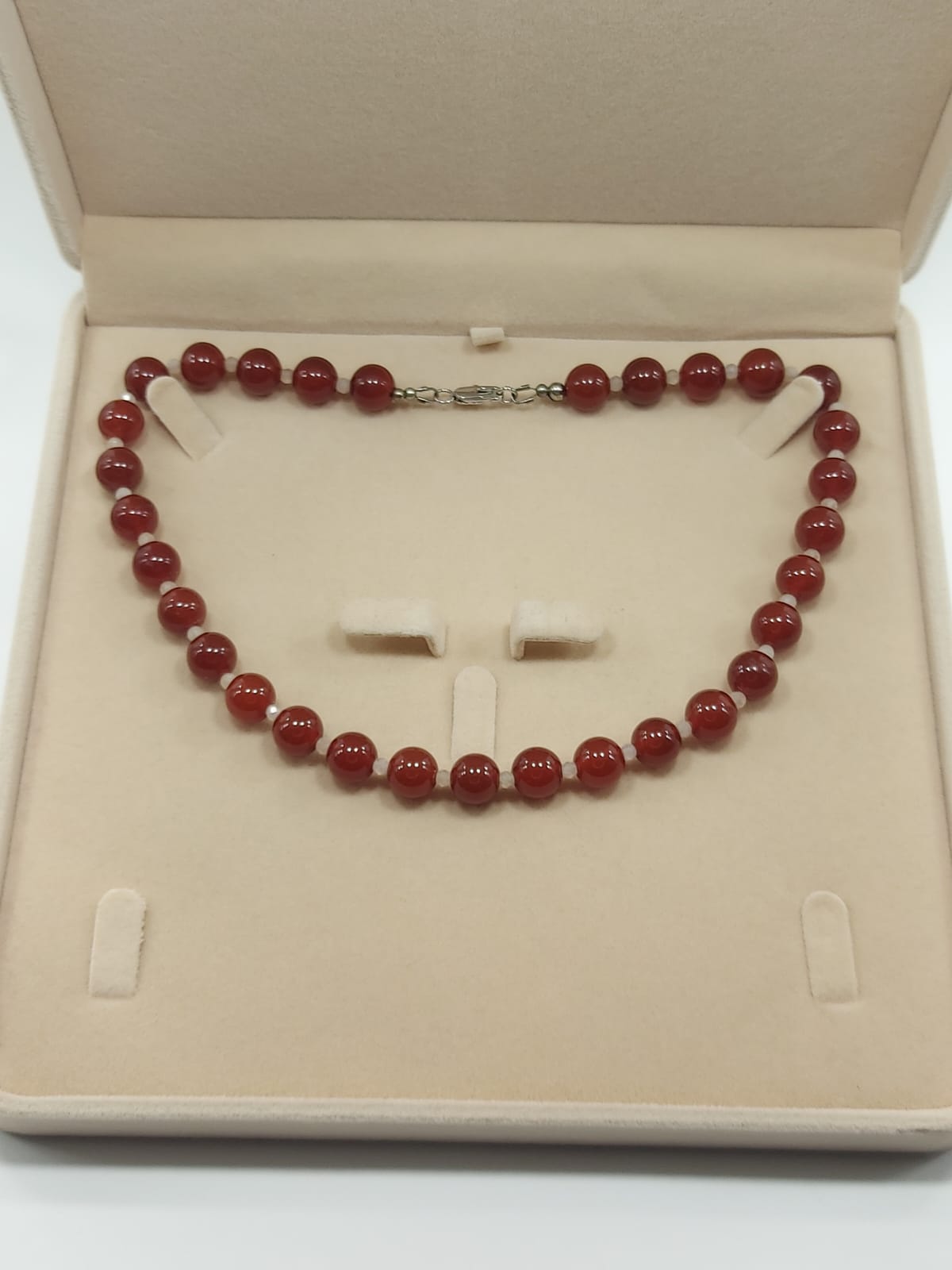 ყელსაბამი-ჩოკერის მასალა: ავსტრიული ბროლი, ვარდისფერი ჰემატიტი, ვერცხლისფერი ბიჯუტერია, ბისერი.