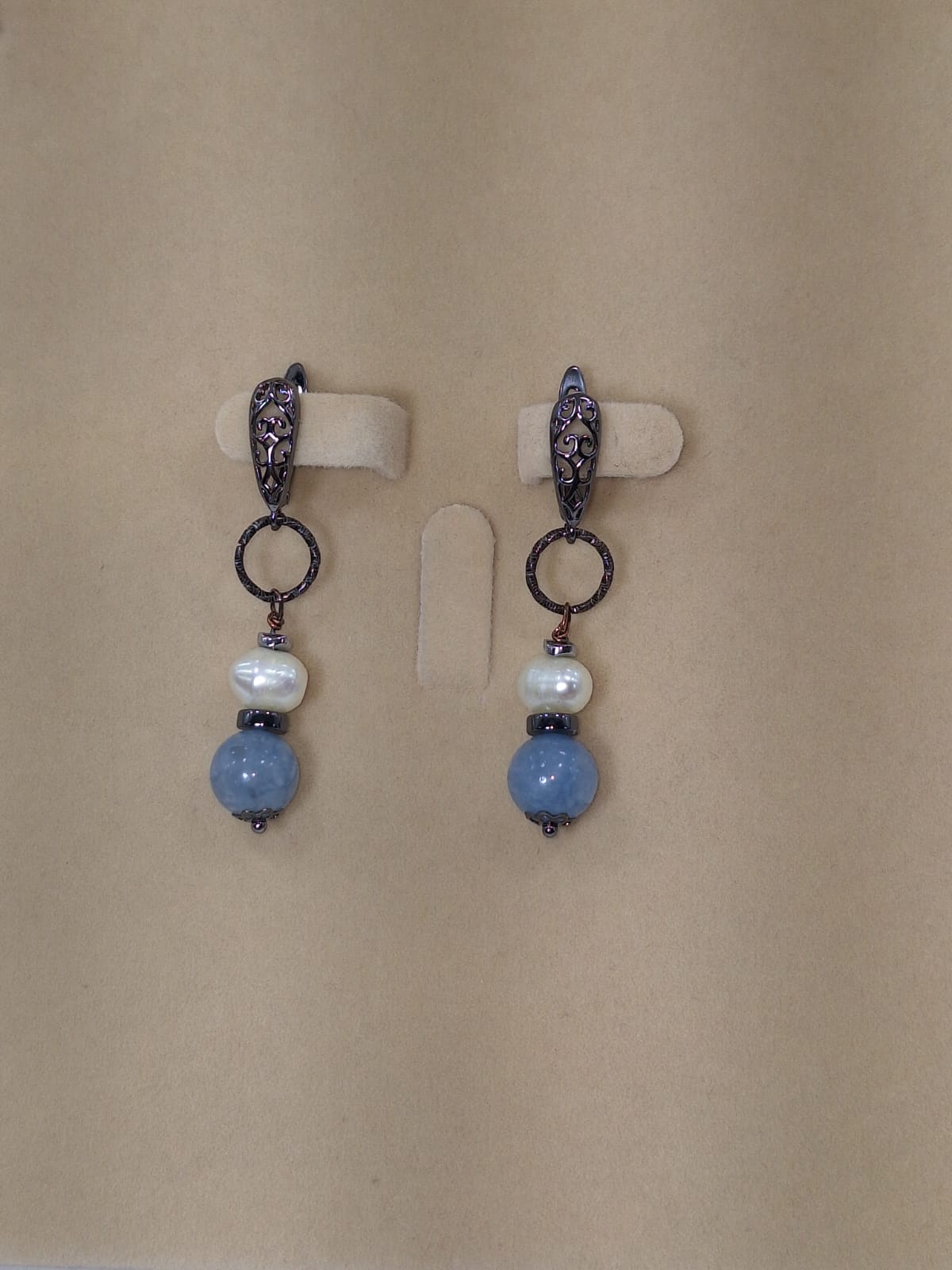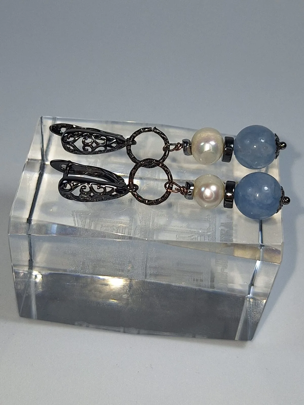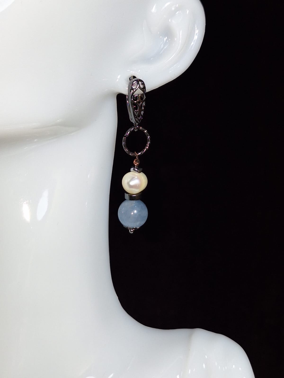 მასალა: აკვამარინი, თეთრი მდინარის მარგალიტი, ჰემატიტის დისკი, შავი ფერის მეტალის უჟანგავი ფურნიტურა და ანტიალერგიული ინგლისური სტილის შესაკრავი.
