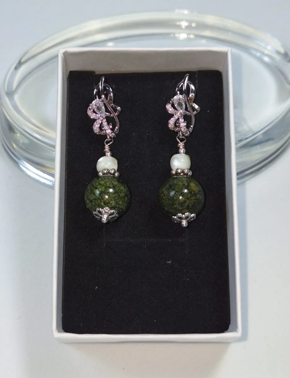 მასალა: გველის ქვა ( მწვანე იასპი), თეთრი საიტის დისკი, ვერცხლისფერი ფურნიტურა, ანტიალერგიული და საფირებით გაწყიბილი შესაკრავი.