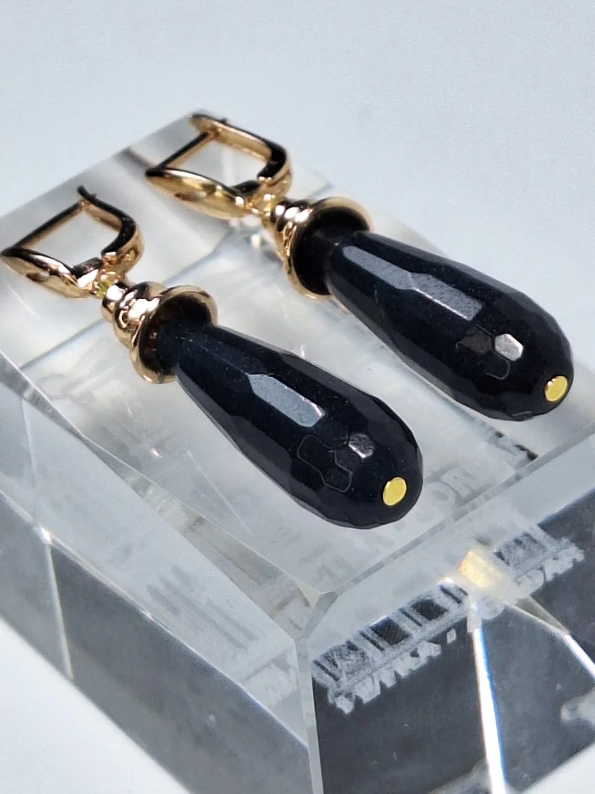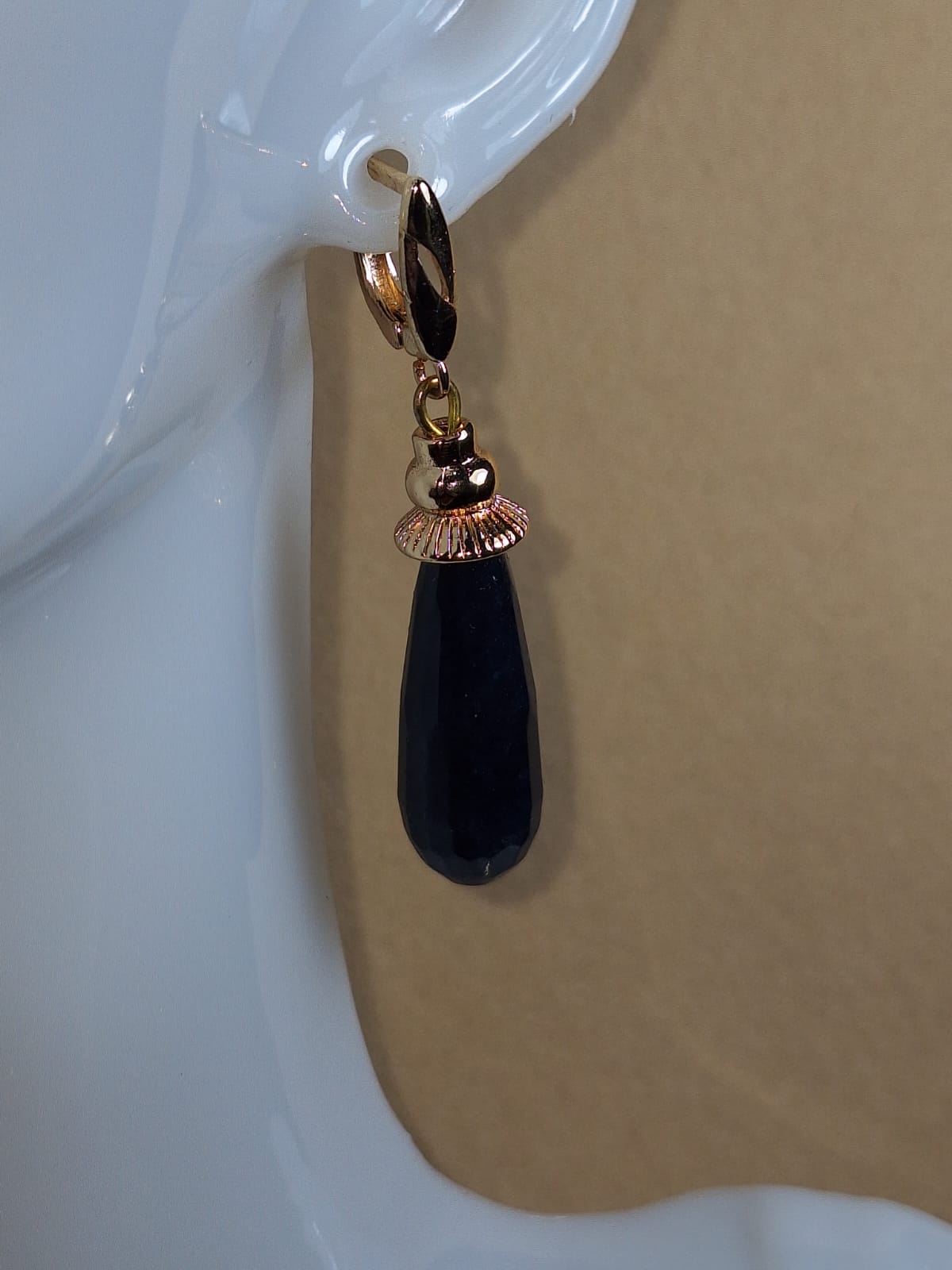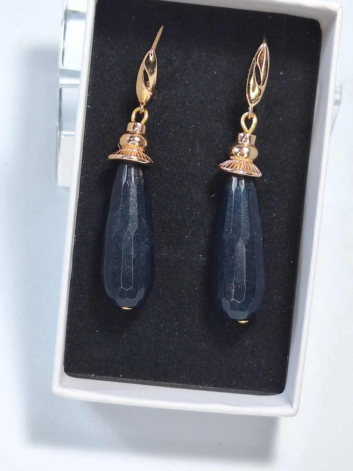 საყურის მასალა მასალა: მუქი ლურჯი ცრემლის ფორმის ხალცედონი, ოქროსფერი უჟანგავი ფურნიტურა და ანტიალერგიული, ინგლისური სტილის შესაკრავი.