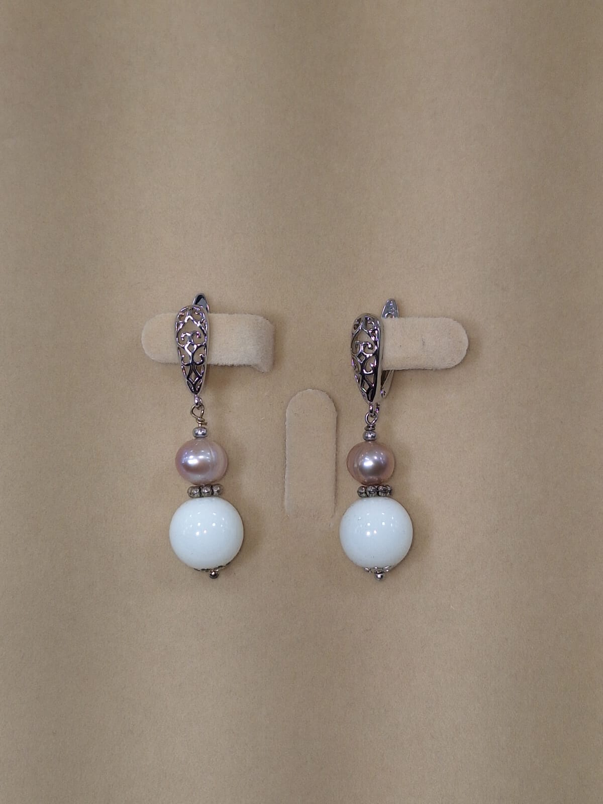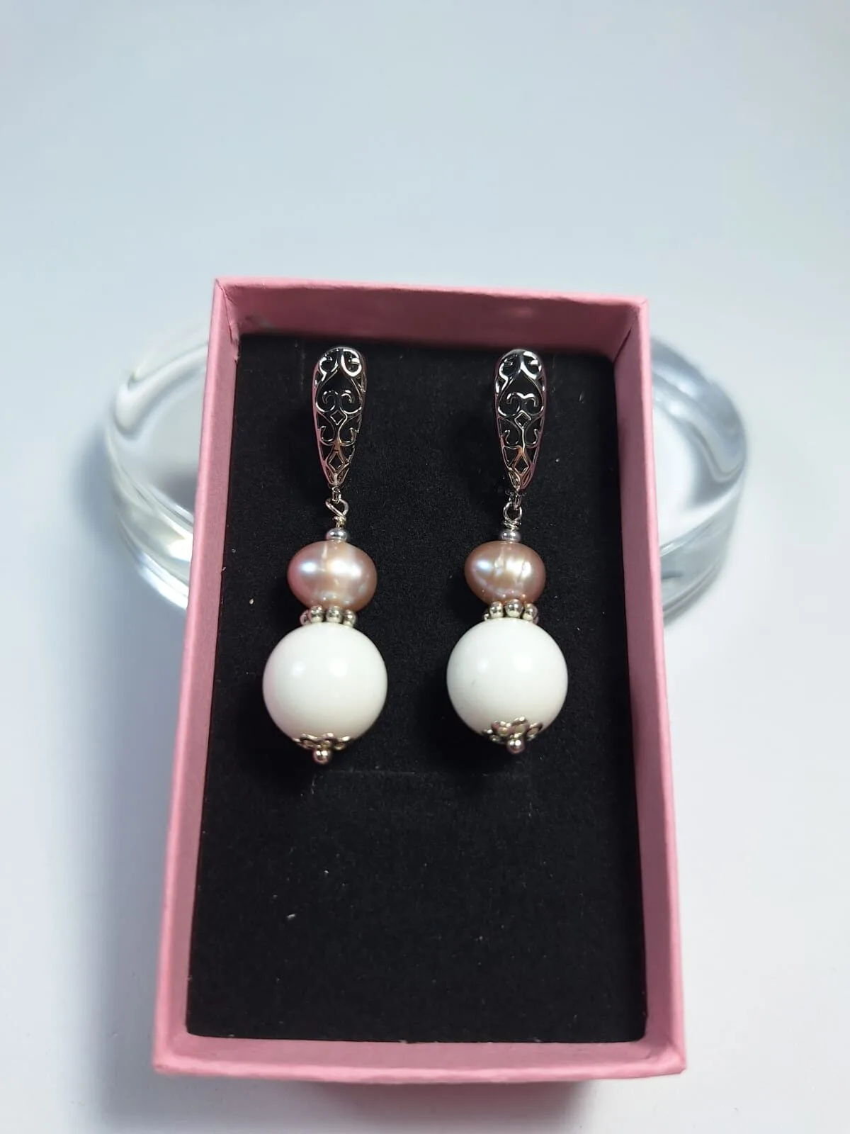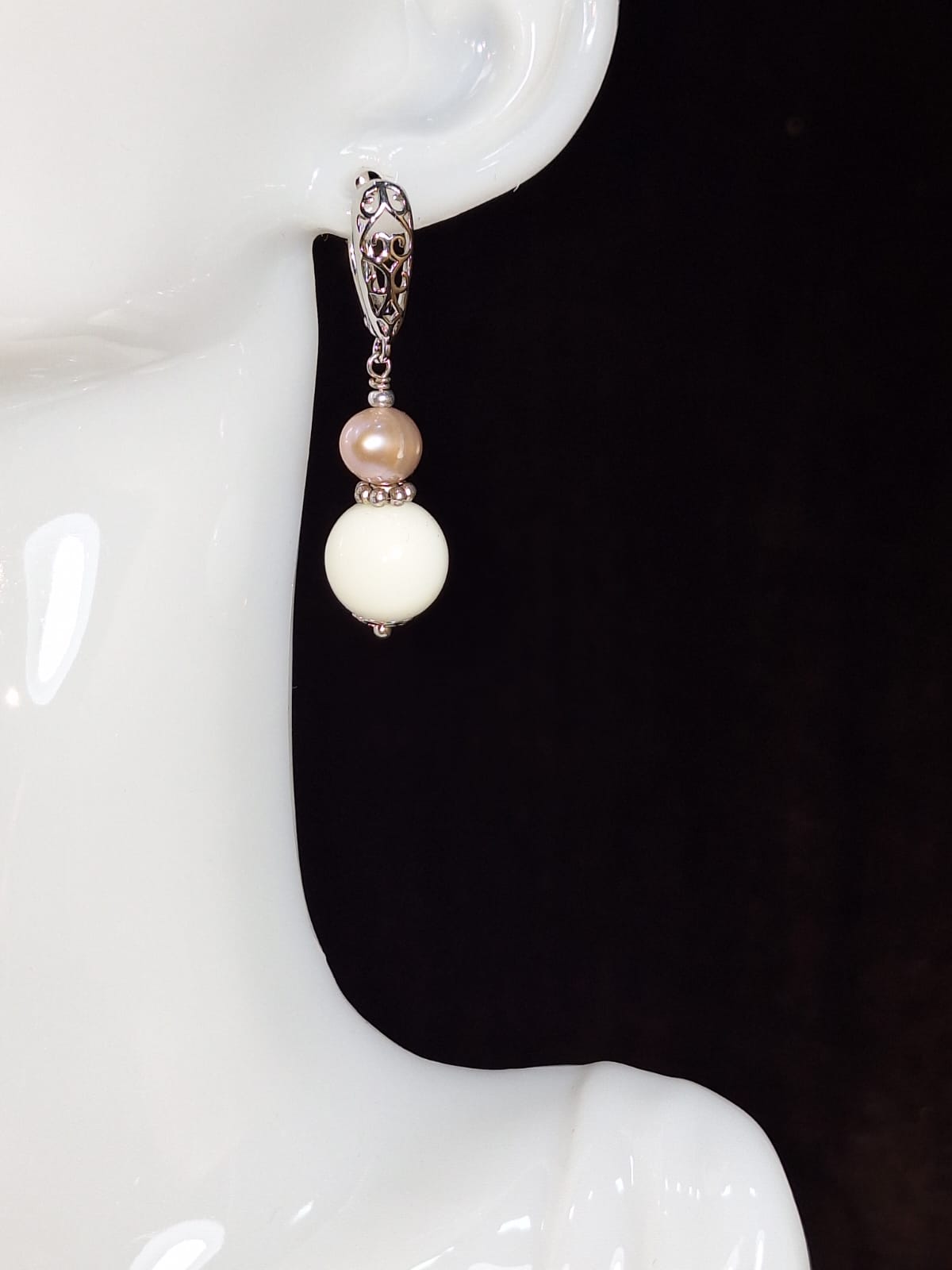 საყურე – ვარდისფერი მარგალიტი და თეთრი აგატი