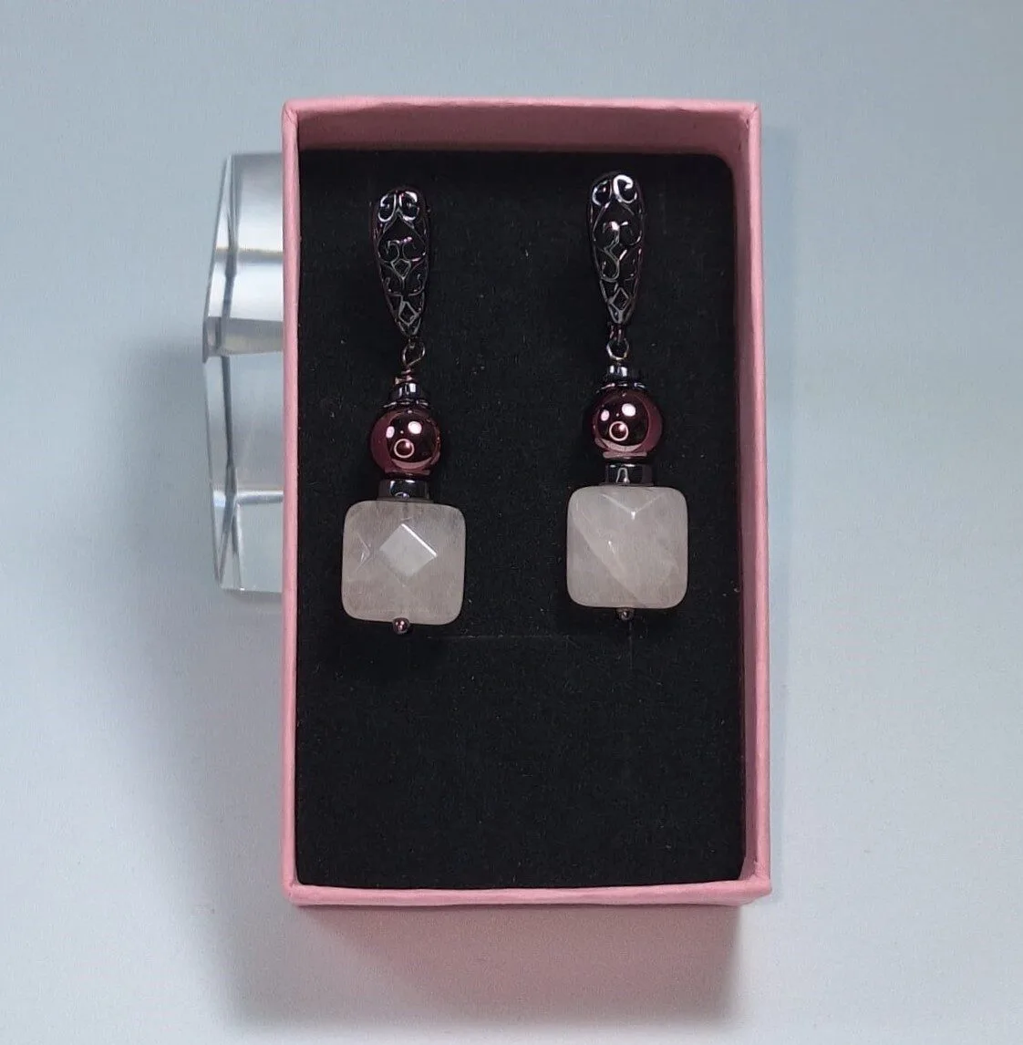 საყურე – ვარდისფერი კვარცი და ჰემატიტი
