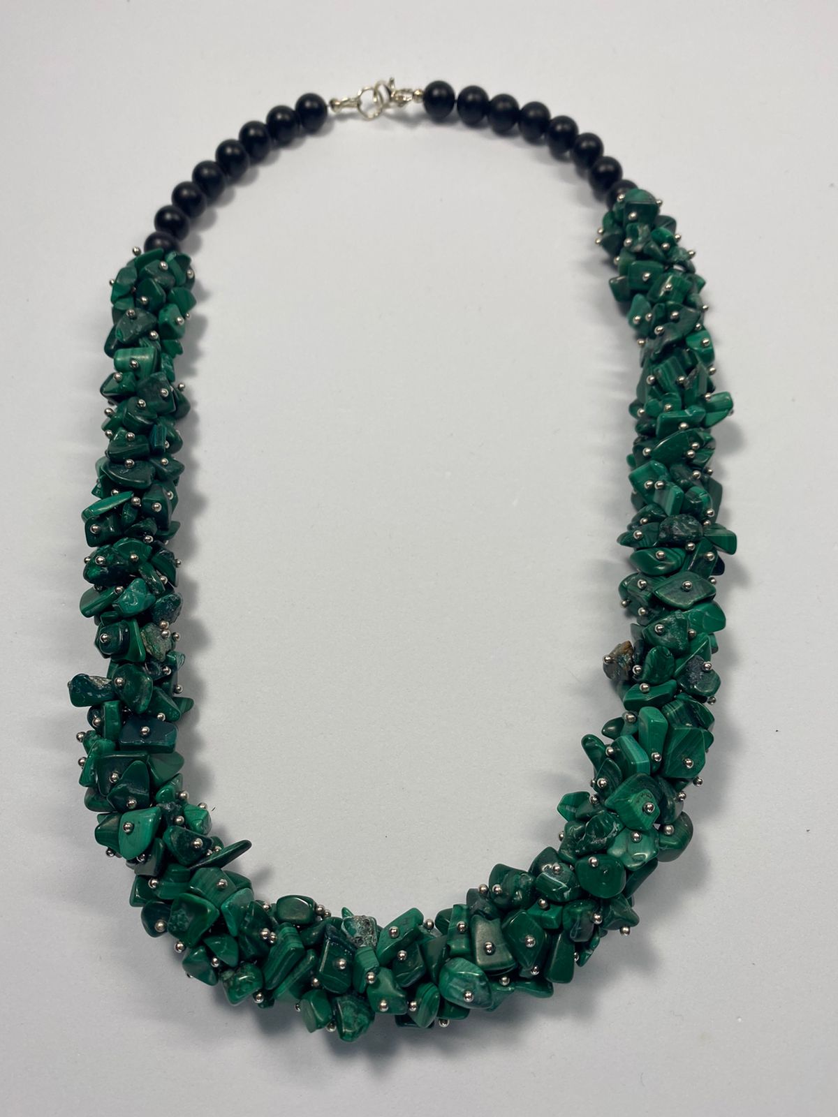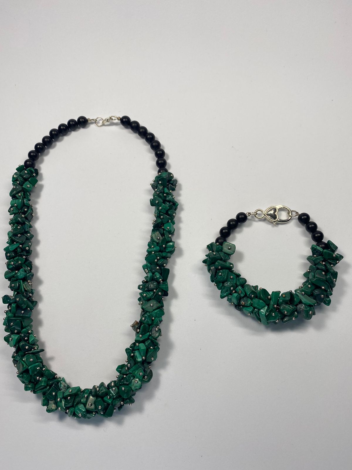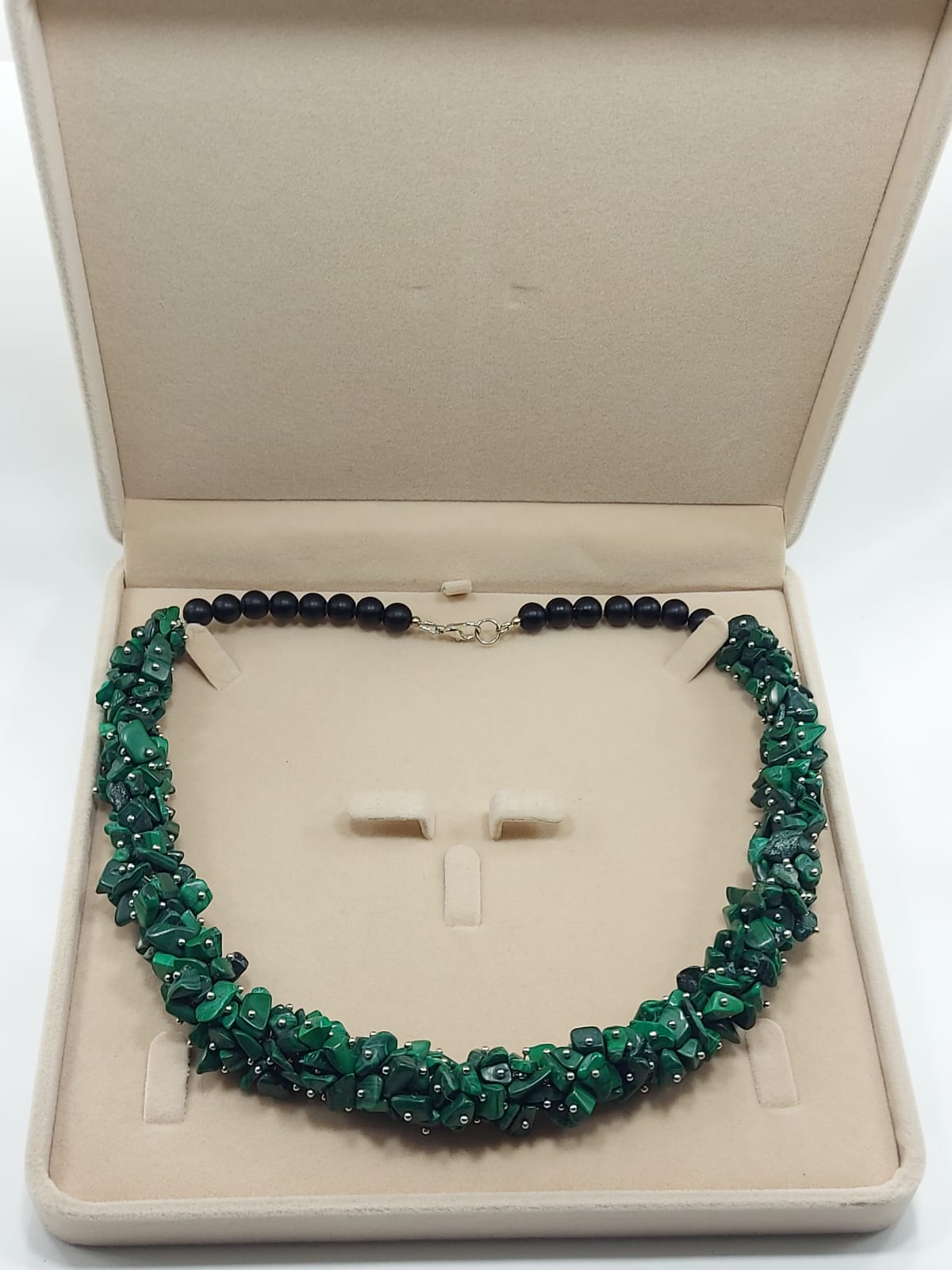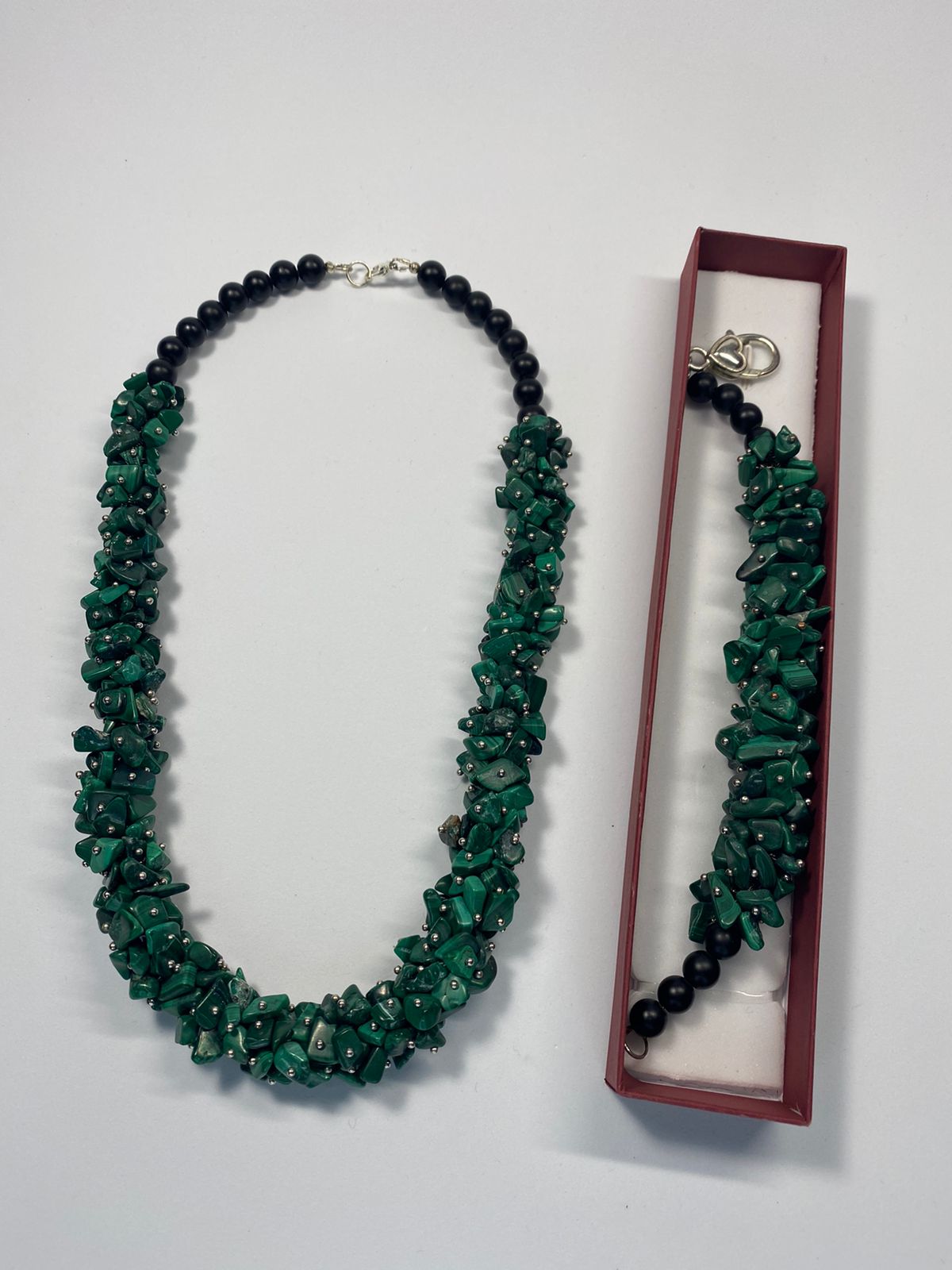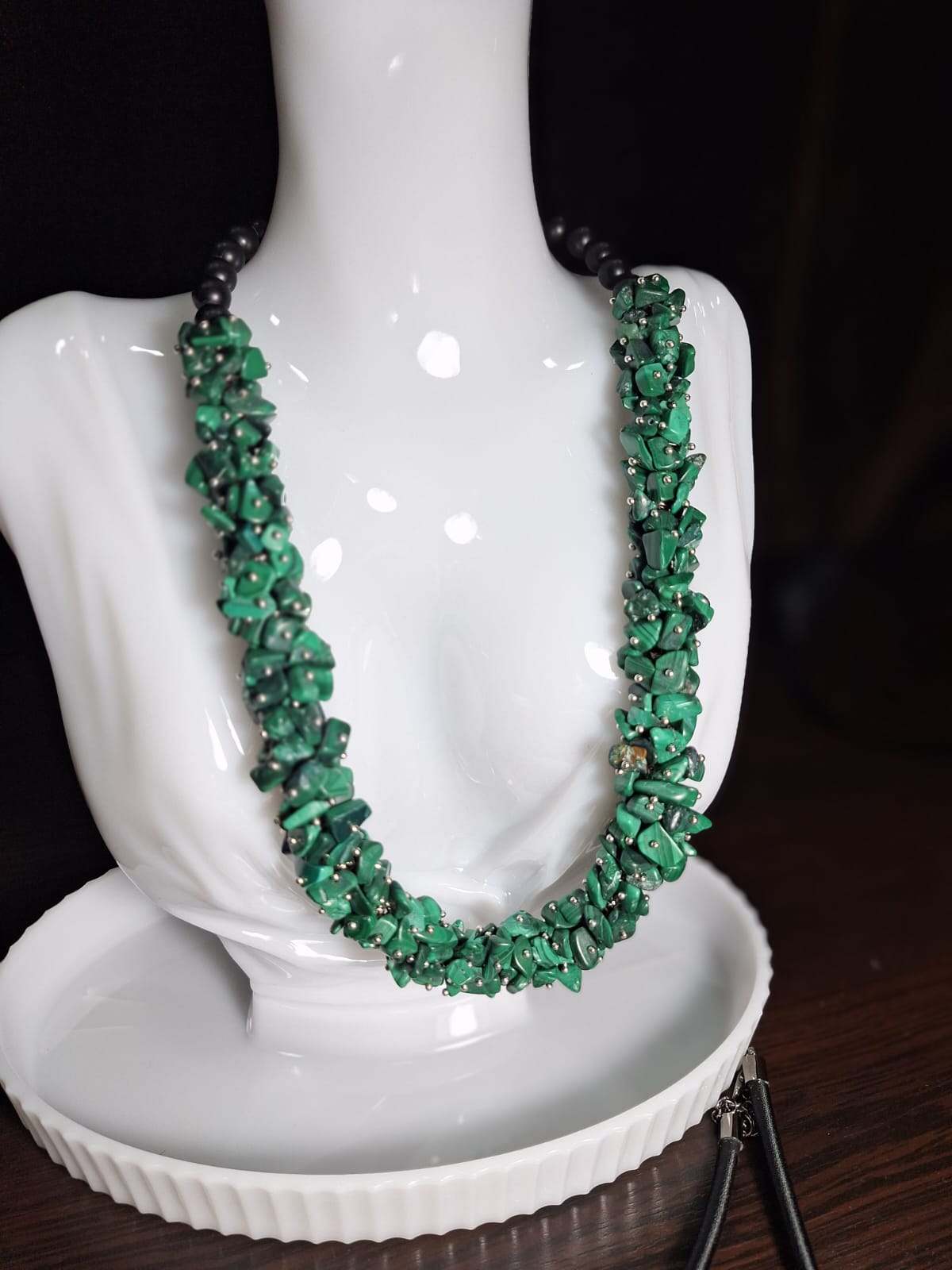 ყელსაბამის მასალა: ბუნებრივი მალახიტის ნამსხვრევები ვერცხლისფერ პინებზე (დიამეტრი 16მმ) და შავი შუნგიტის მრგვალი მძივები (დიამერტი 6მმ).